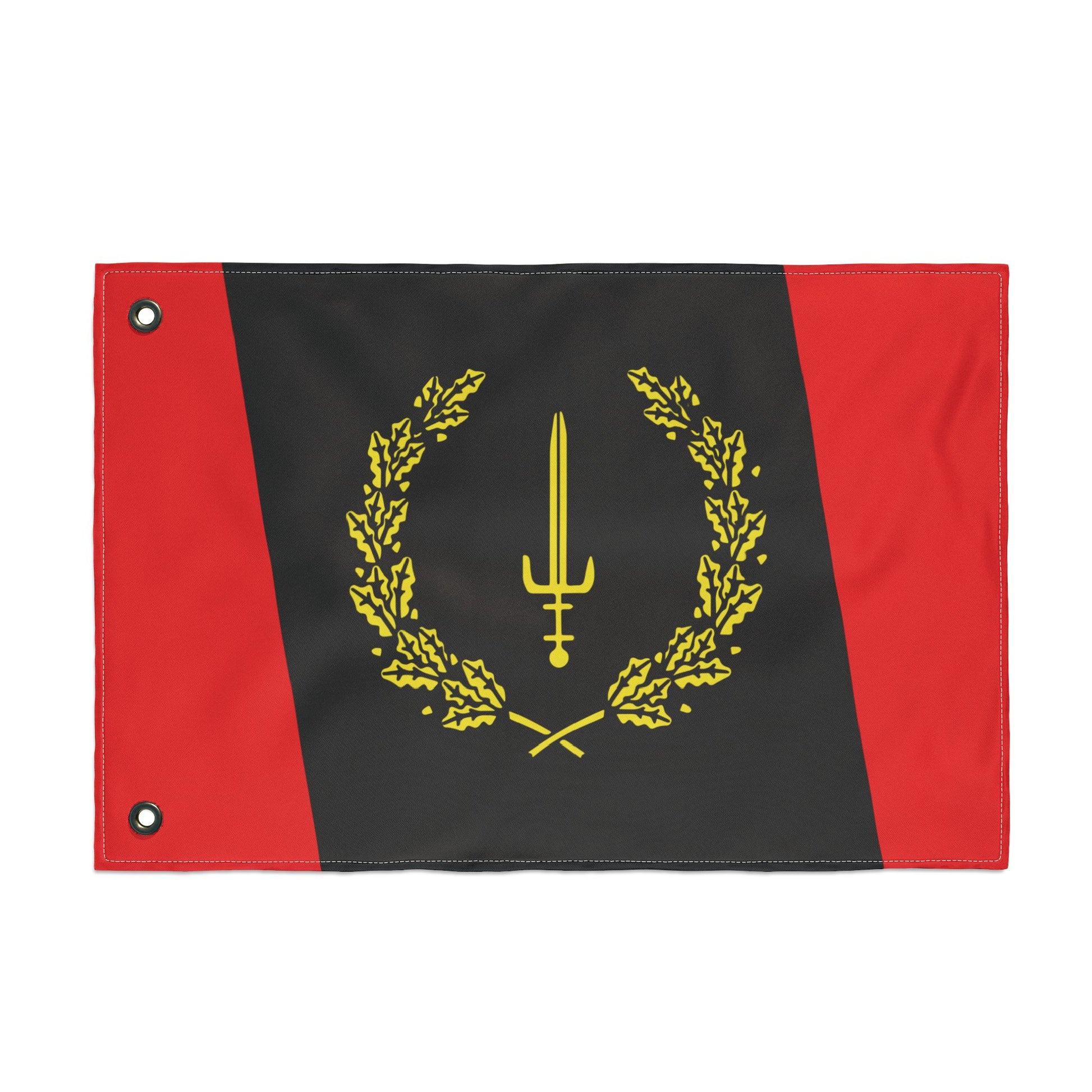 The Black American Heritage flag was designed in 1967 by Melvin Charles and Gleason T. Jackson. According to the designers, "...the elements of the flag include the color black to represent pride and pigmentation and race; red, to remind us of the rich blood black men have shed for freedom, equality, justice and gold, to represent intellect, prosperity, and peace. These colors are woven into a composition that juxtaposes the red and black in a set of three stripes: one black stripe centered between two red." " Superimposed on the black stripe is a golden wreath of fig leaves. The cultivated fig is a native of Africa, and ranks as one of the most ancient of life-sustaining fruits. Centered within the golden wreath is a blunted Moorish boarding sword, symbol of leadership carried by the great Moorish leaders of the 8th century. The sword represents the strength and authority exhibited by a black culture that made many contributions to the world in mathematics, art, medicine, and physical science, heralding the contributions that Black Americans would make in these and other fields."